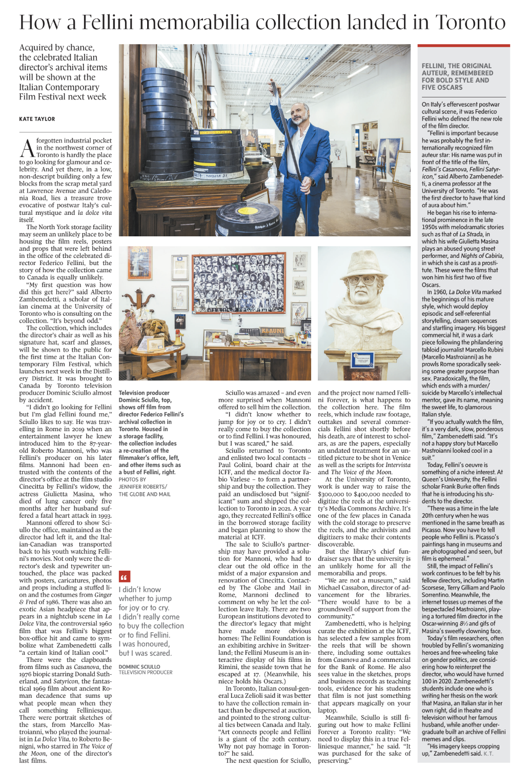 Si è svolta a Casa Loma, la festa per celebrare Fellini forever, la mostra inaugurata lo scorso 4 settembre che raccoglie costumi copioni e cimeli arrivati da Cinecittà, in omaggio al genio del regista riminese.